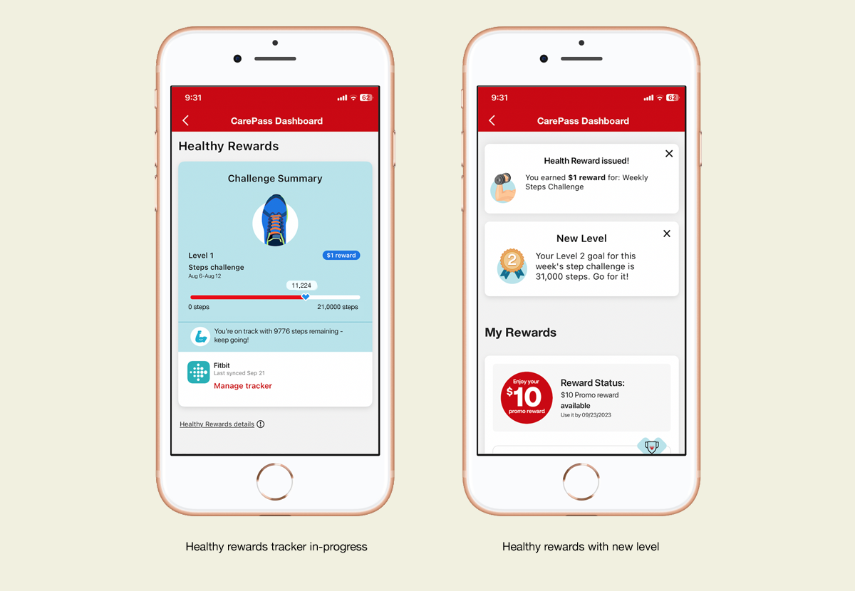 The Healthy Rewards with Step Tracker feature (iOS & Android) was created to enable automatic reward earning through step challenges and fitness goal completion. The system tracks weekly steps and distributes rewards when targets are met, seamlessly integrating with mobile devices (i.e., FitBit, Apple Watch) across Android and iOS platforms.